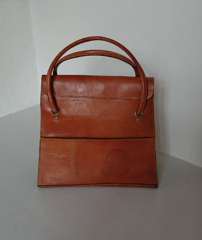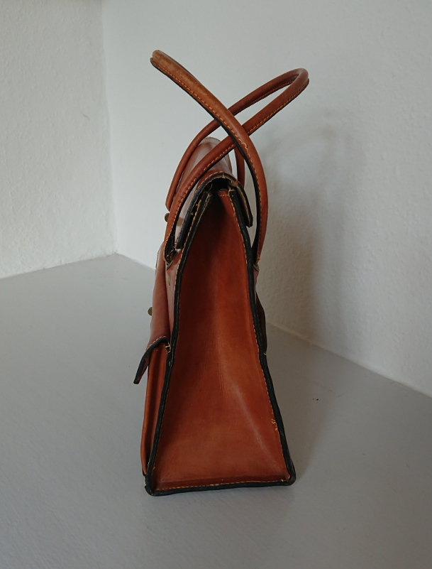 Retro skoletaske i kernelæder. Den er foret og har en lomme foran og en lomme indeni. På lomme foran er der præget våbenskjold af en løve og en fransk lilje.